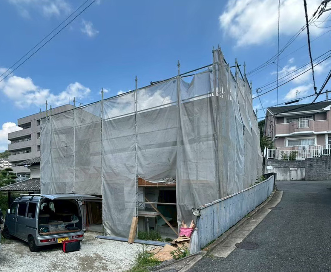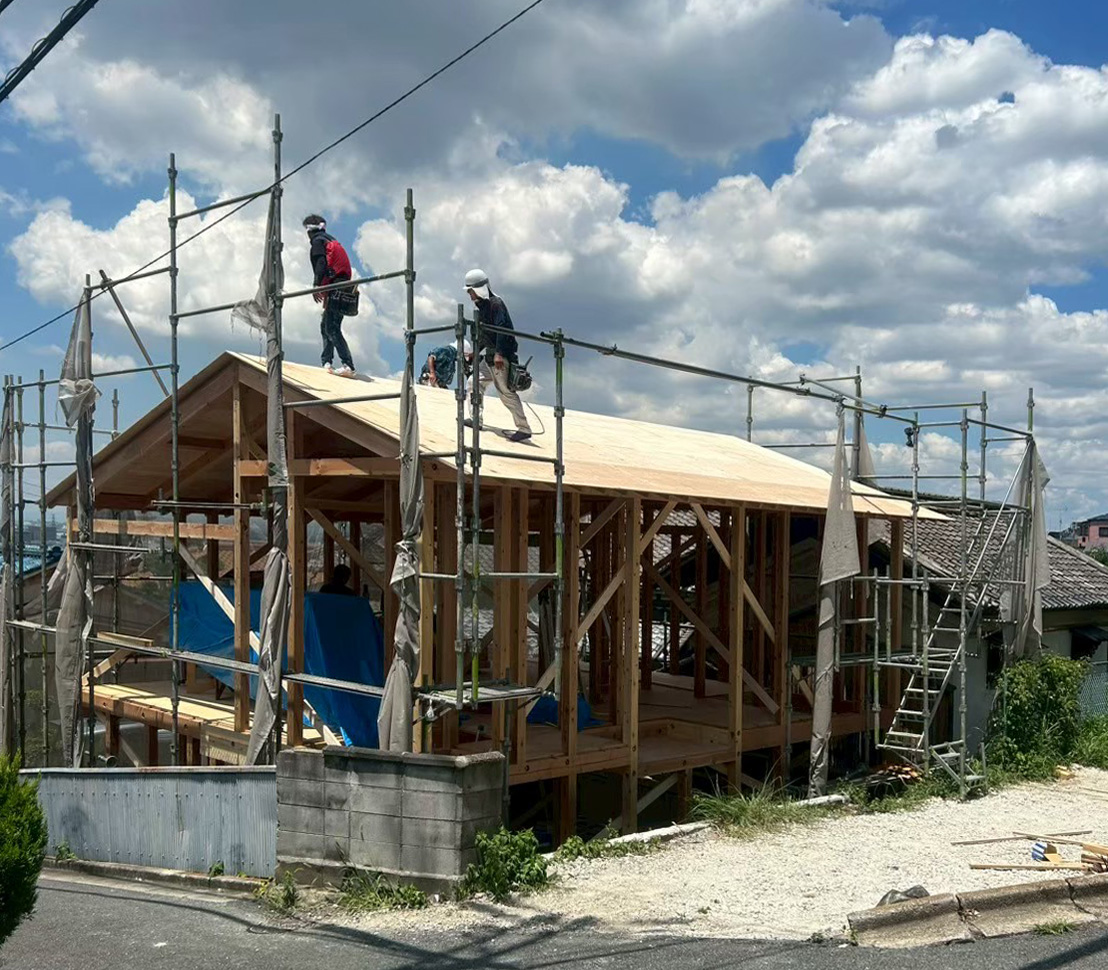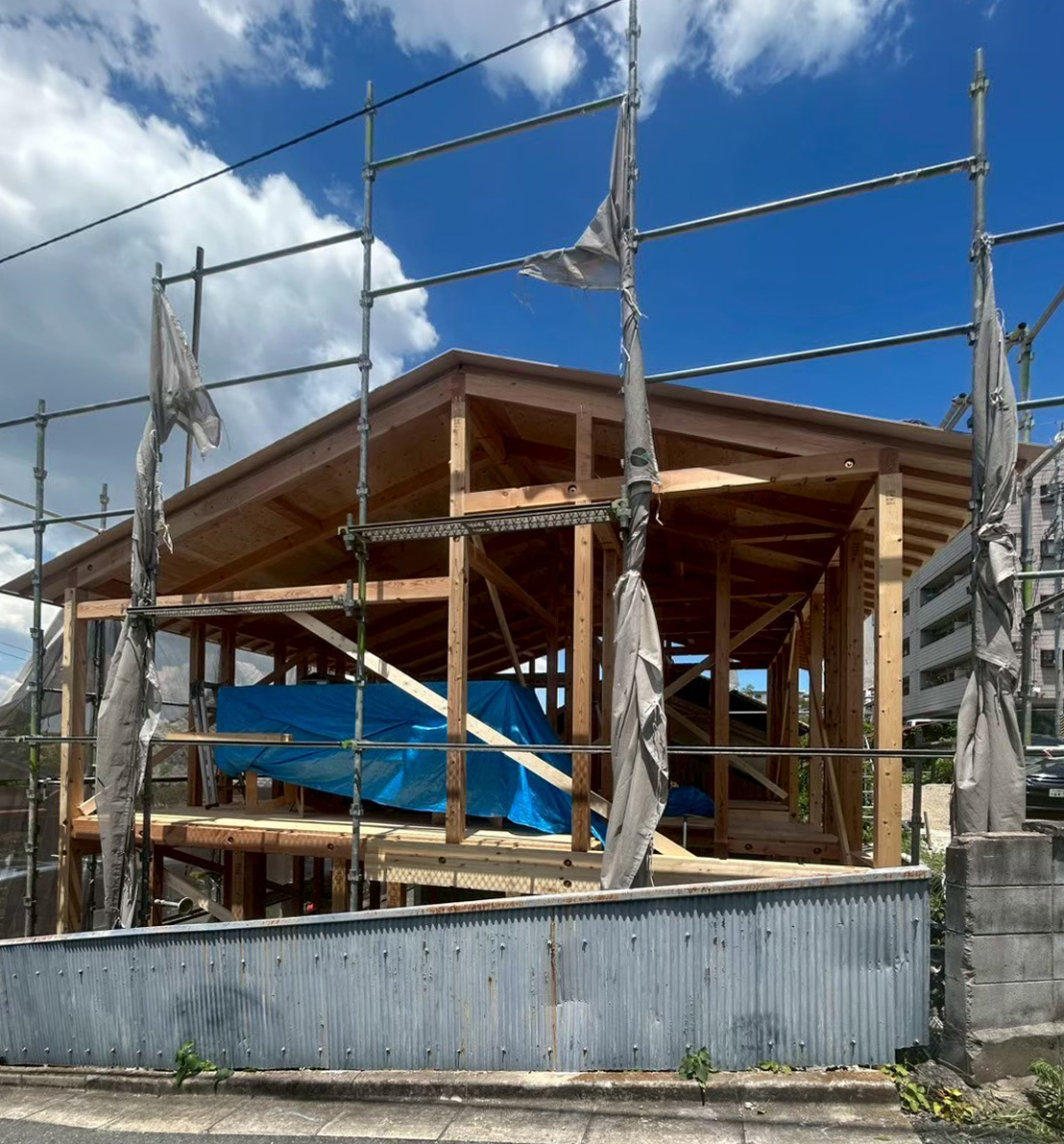 見学する東大阪の ガレージハウス4 外観(工事中)。ガレージとアトリエの入り口が見える