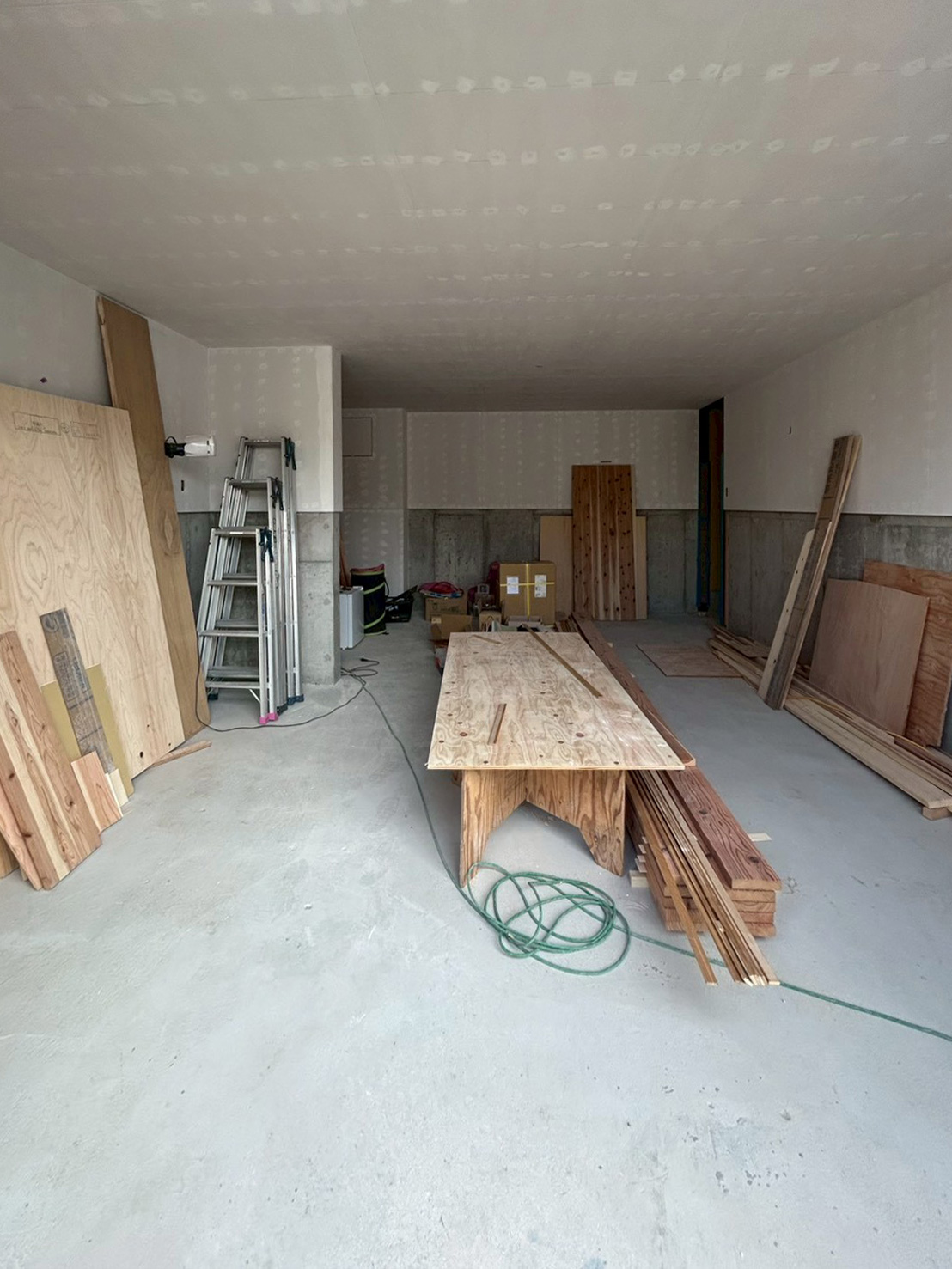工事中のガレージ内。右奥の扉からアトリエ、2階へと繋がっている