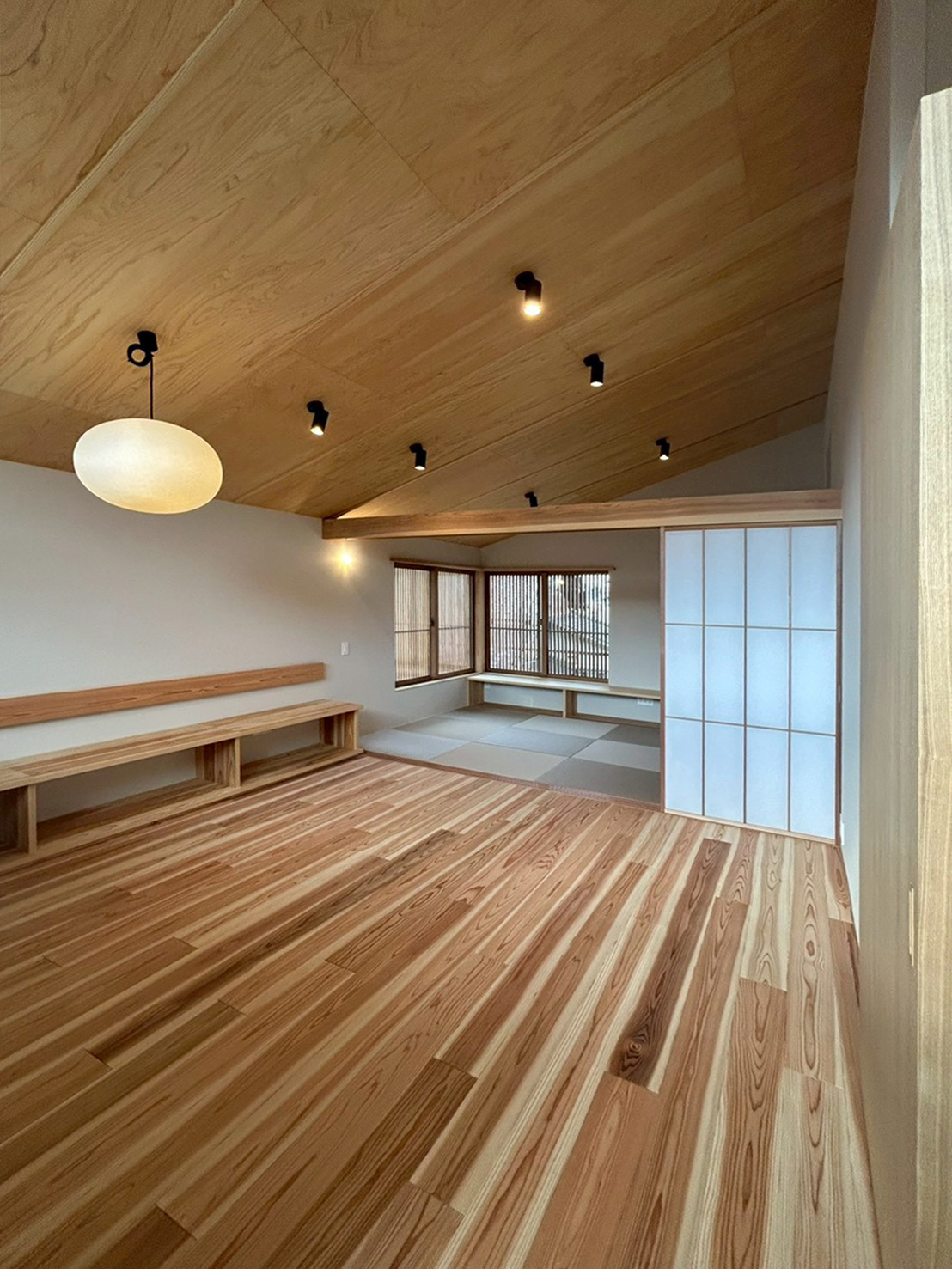 2階にある開口部からは大阪平野の眺望が広がり、眺望も楽しめる。また室内には国産の針葉樹を使い、落ち着いた雰囲気を生み出すとそもに、経年変化も楽しめます。