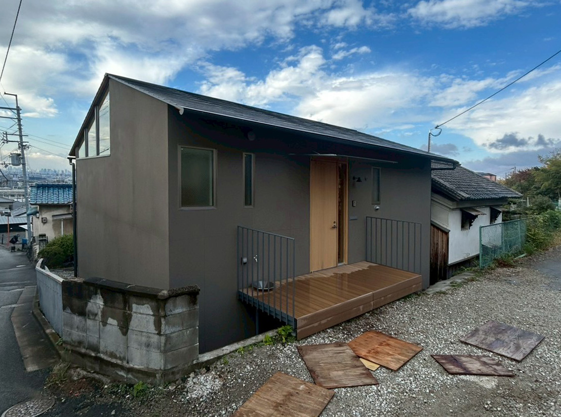 大阪平野の眺望が望める東大阪の生駒山の麓にある棚田状の崖地。ここにある母屋の隣に完成したガレージハウスの完成見学会を開催します。