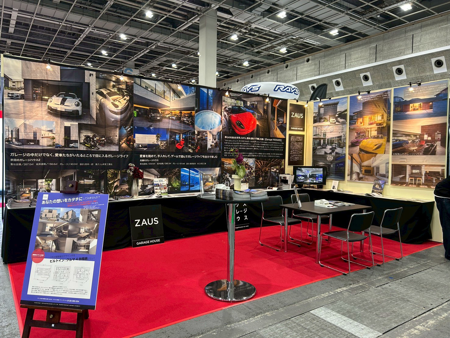 パネル・平面図・模型などを使いガレージハウスを紹介しています。オートメッセにご来場の際はぜひお立ち寄りください。